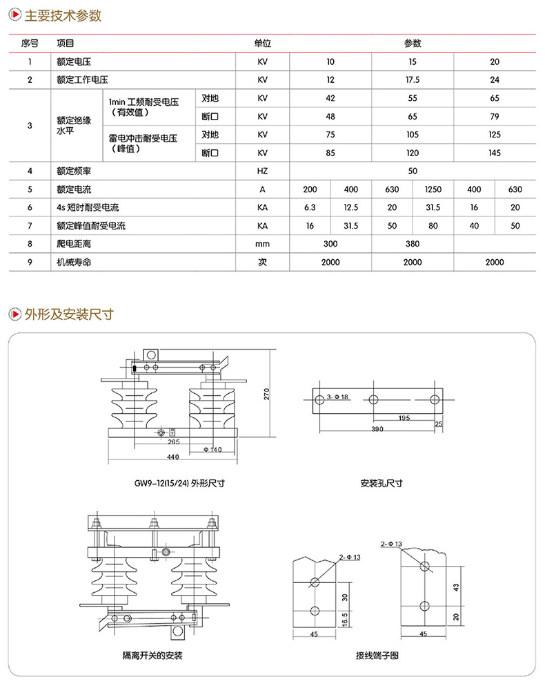 GW9-12(15/24)型户外高压隔离开关为交流50Hz的户外高压电器设备,额定电压等级有10KV,15KV,24KV供高压线路在无负载倩况下进行开合,以及对被检修高压母线、断路器等电气设备带电的高压线路进行电气隔离之用,也可用于开、合小的电容或电感电流。