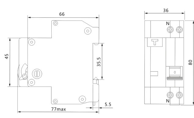 ● 断路器极数为: 2P(1个保护极,N极可开闭)