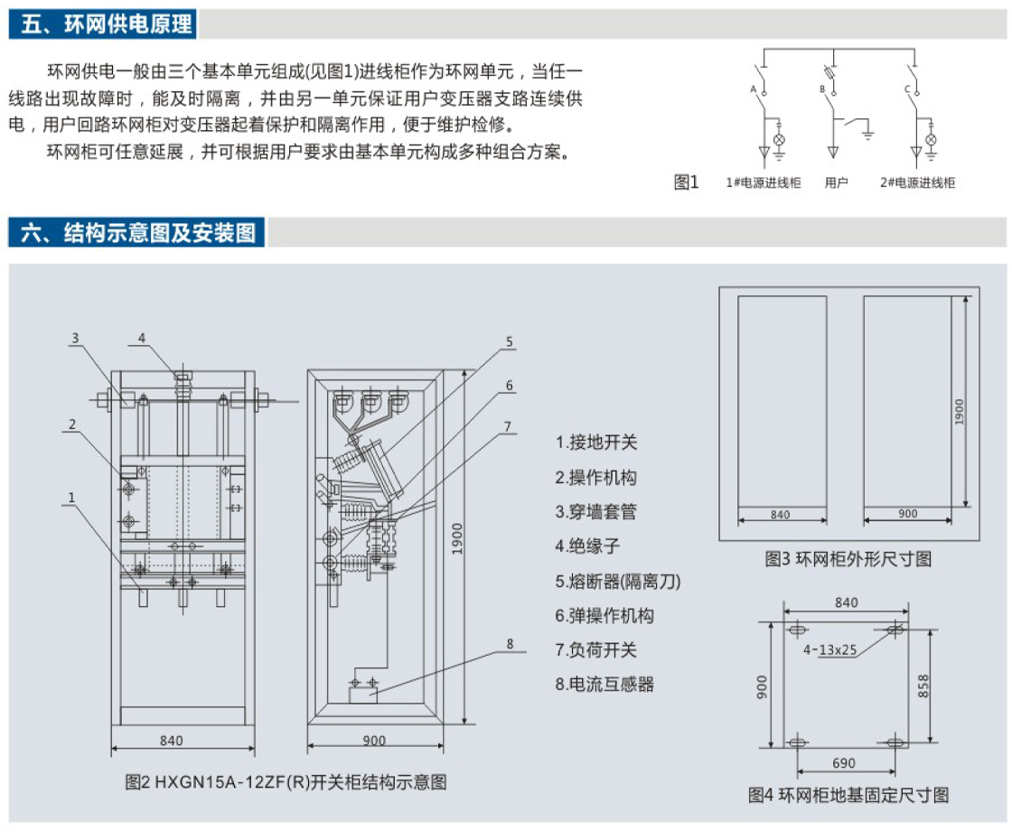 HXGN15A-12ZF(R)型箱式(固定)金属封闭环网开关设备(简称环网柜)是为城市电网改造和建设需要而生产的新型高压开关柜,在供电系统中亦作为开断负荷电流和短路电流以及关合短路电流之用。本环网柜配用真空负荷开关,操作机构为弹簧操动机构,该机构既可手动操作,也可电动操作。接地开关和隔离刀配用手动操作机构,本环网柜成套性强,体积小,无燃烧和爆炸危险,具有可靠的“五防”功能。