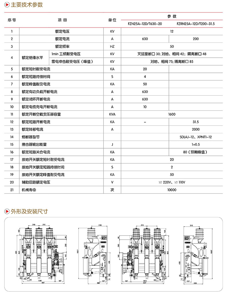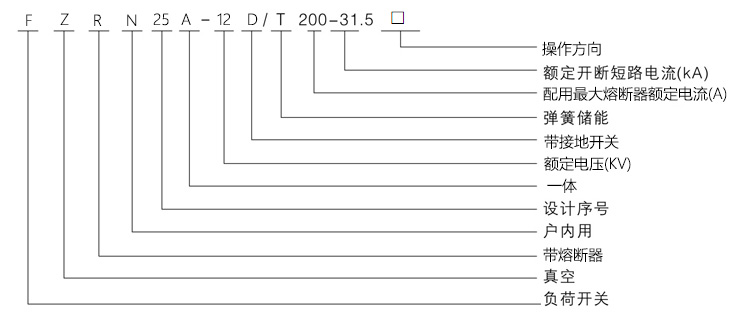 FZRN25A-12D/T200-31.5型户内交流高压真空负荷开关-熔断器组合电器是三相交流50Hz、额定电压12Kv的户内装置,适用于工矿企业配电所及变电站等场合,作负荷控制和短路保护之用。